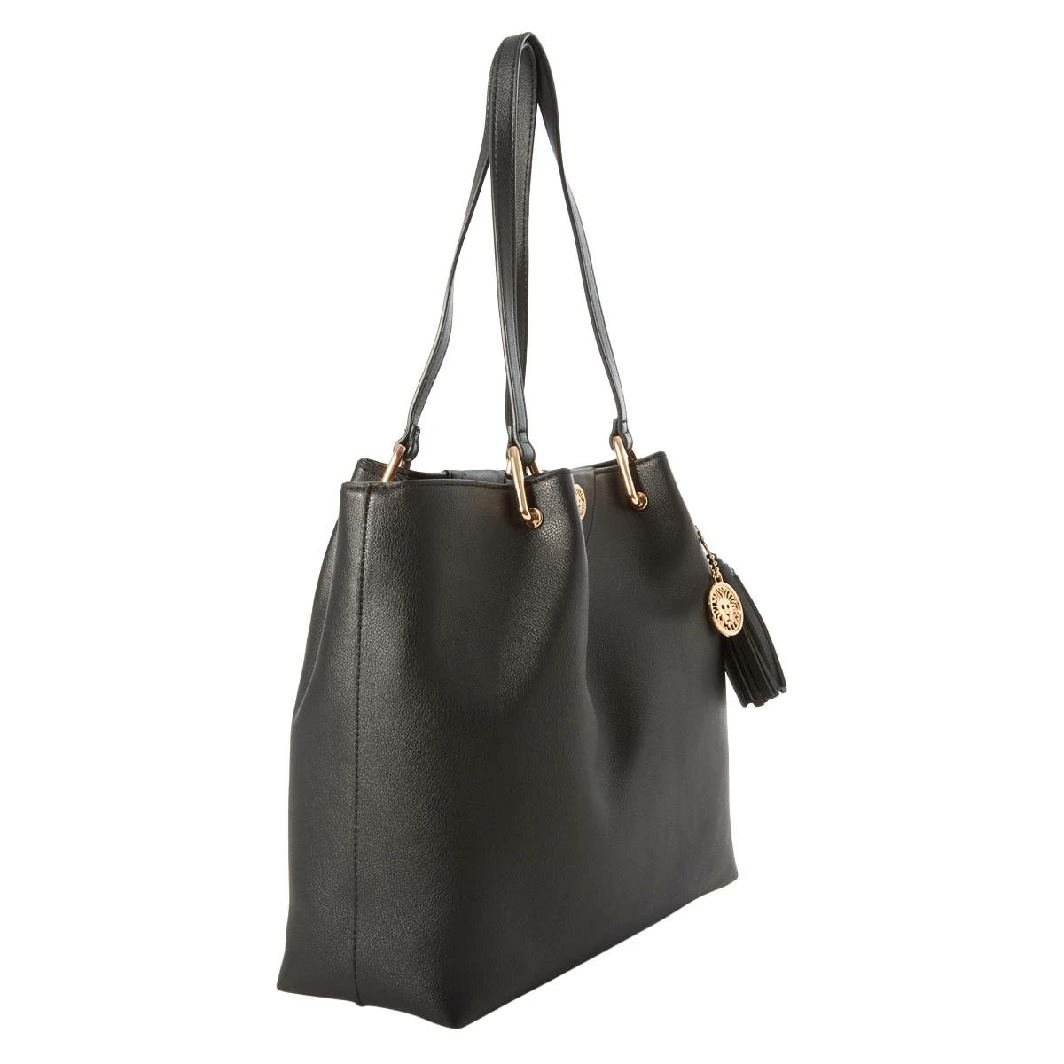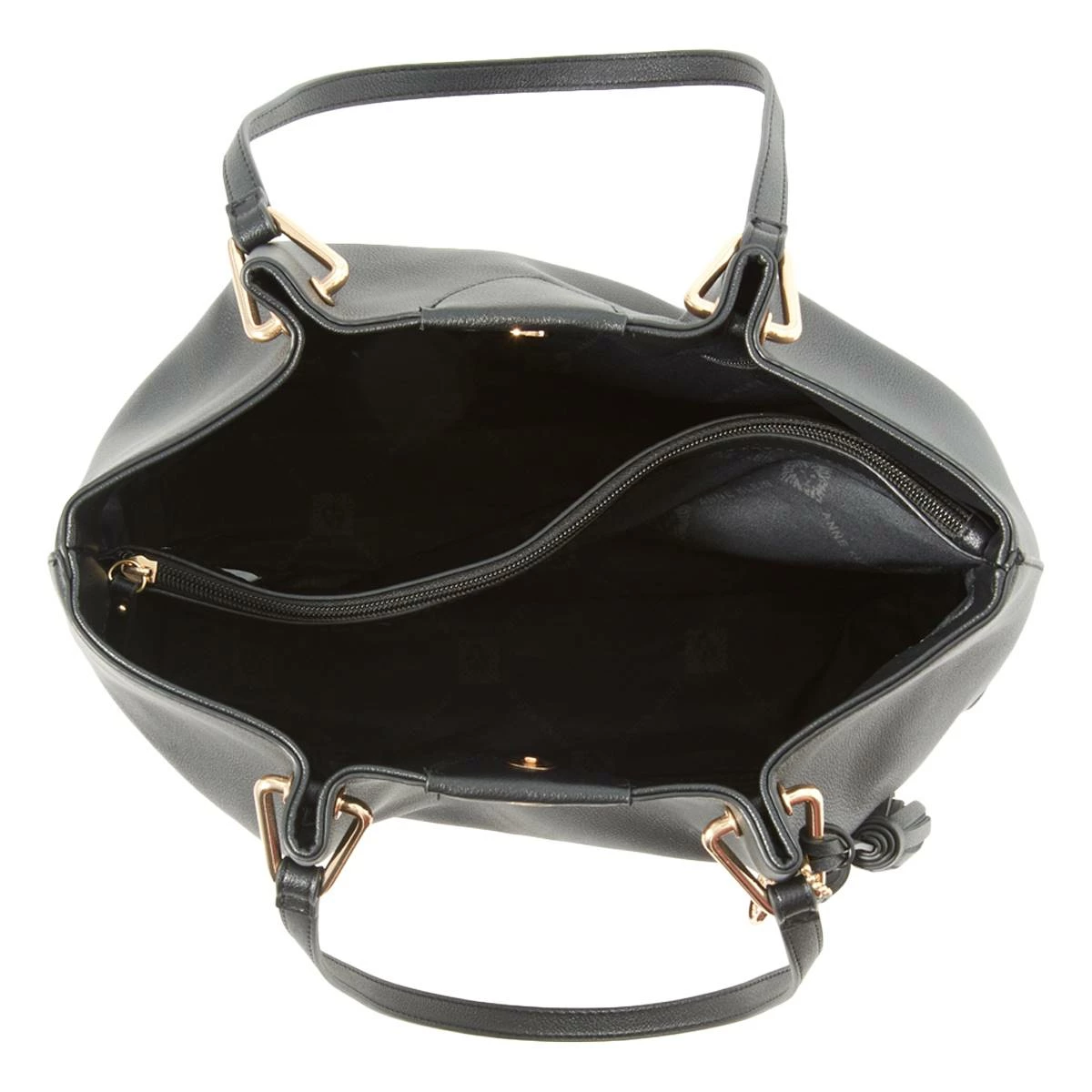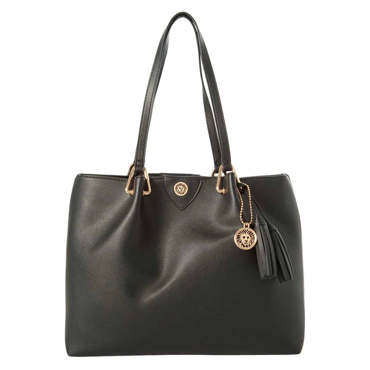 This renowned Anne Klein a-hinge tote continues to prove why it would be a staple piece to any wardrobe. With beautiful a hinge hardware, multiple pockets for organization, and a tassel dangle, this tote screams sophistication.