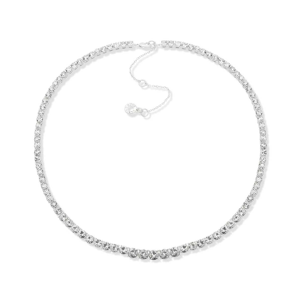 This Anne Klein silver-tone crystal 16-inch plus 3-inch extender 4 prong round stone collar necklace offers a striking sophisticated presence.
