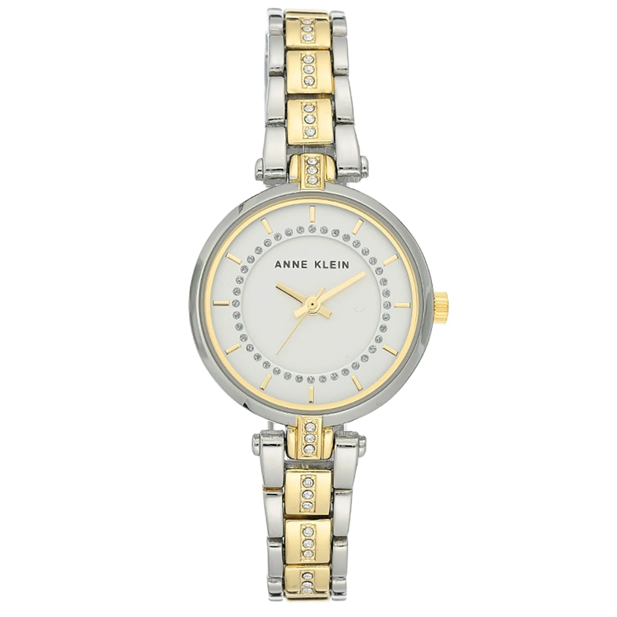 Tell time in style with this Anne Klein two-tone bracelet watch with crystal accents. Features a silver sandblast dial with gold-tone markers and a silver glitter track. The bracelet closes with a 2 push button fold-over buckle and is water resistant up to 100 feet.