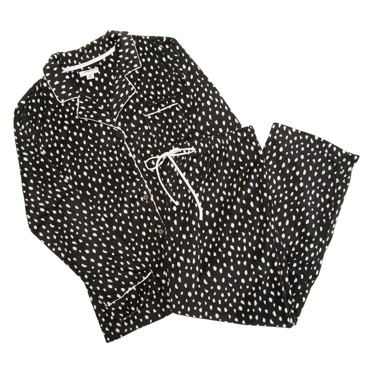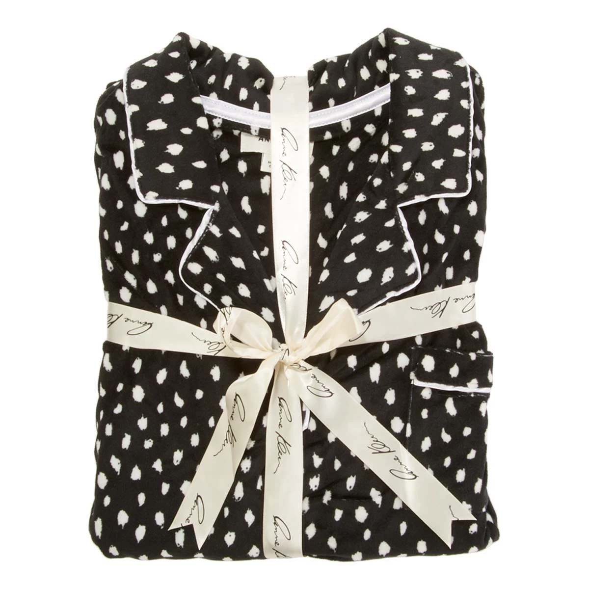 The cozy Womens Anne Klein 2-piece velour folded pajama set includes a long sleeve dotted pajama top with a notch collar. Also providing matching pajama pants with self tie around the waist.