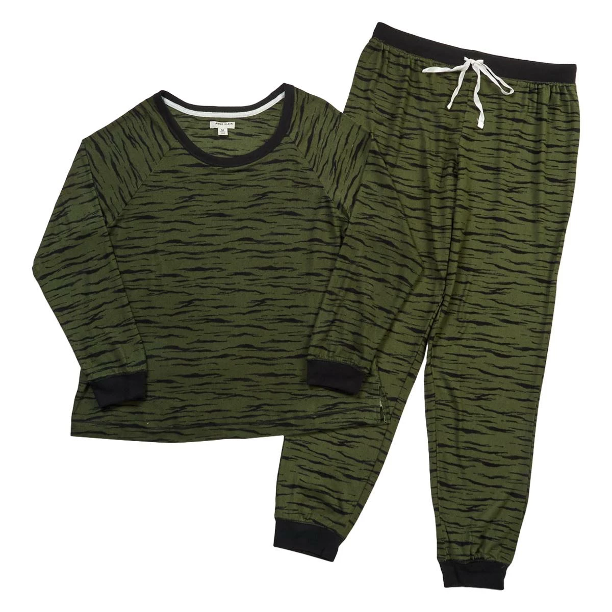 This Womens Anne Klein zebra joggers pajama set is a fun design and will keep you cozy and warm at night. Featuring a long blouson sleeve pajama tee and matching pajama pants with a self tie belt.