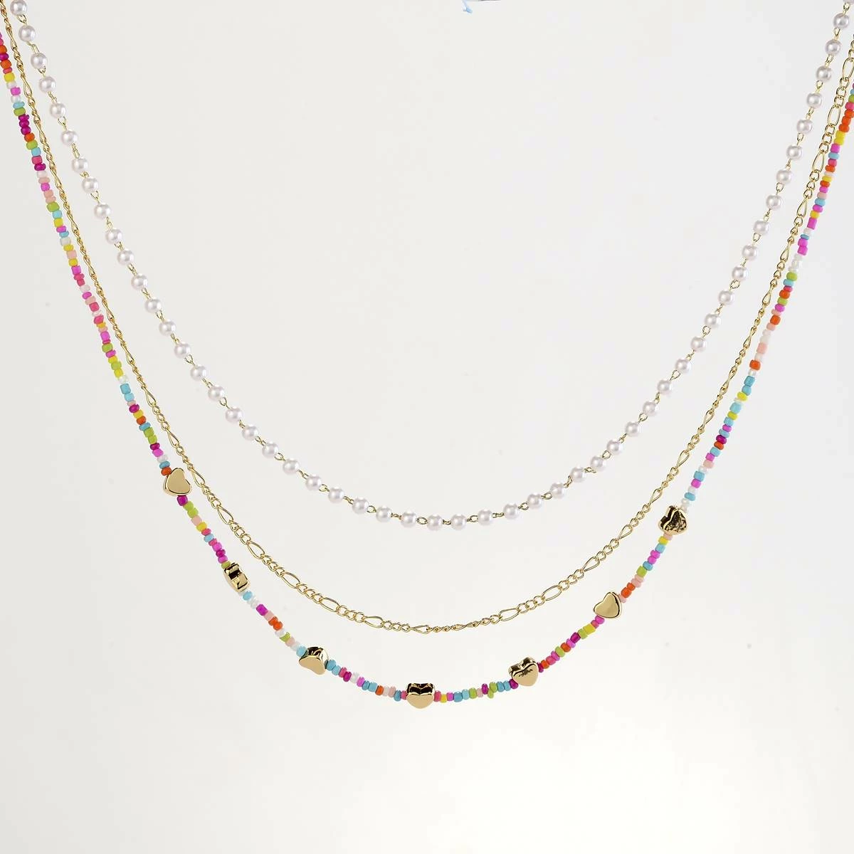 Ashley by Ashley Cooperβ’ 3 row layered necklace with pearls, a colorful bead row with gold hearts, and a gold chain for whimsical feminine style.
