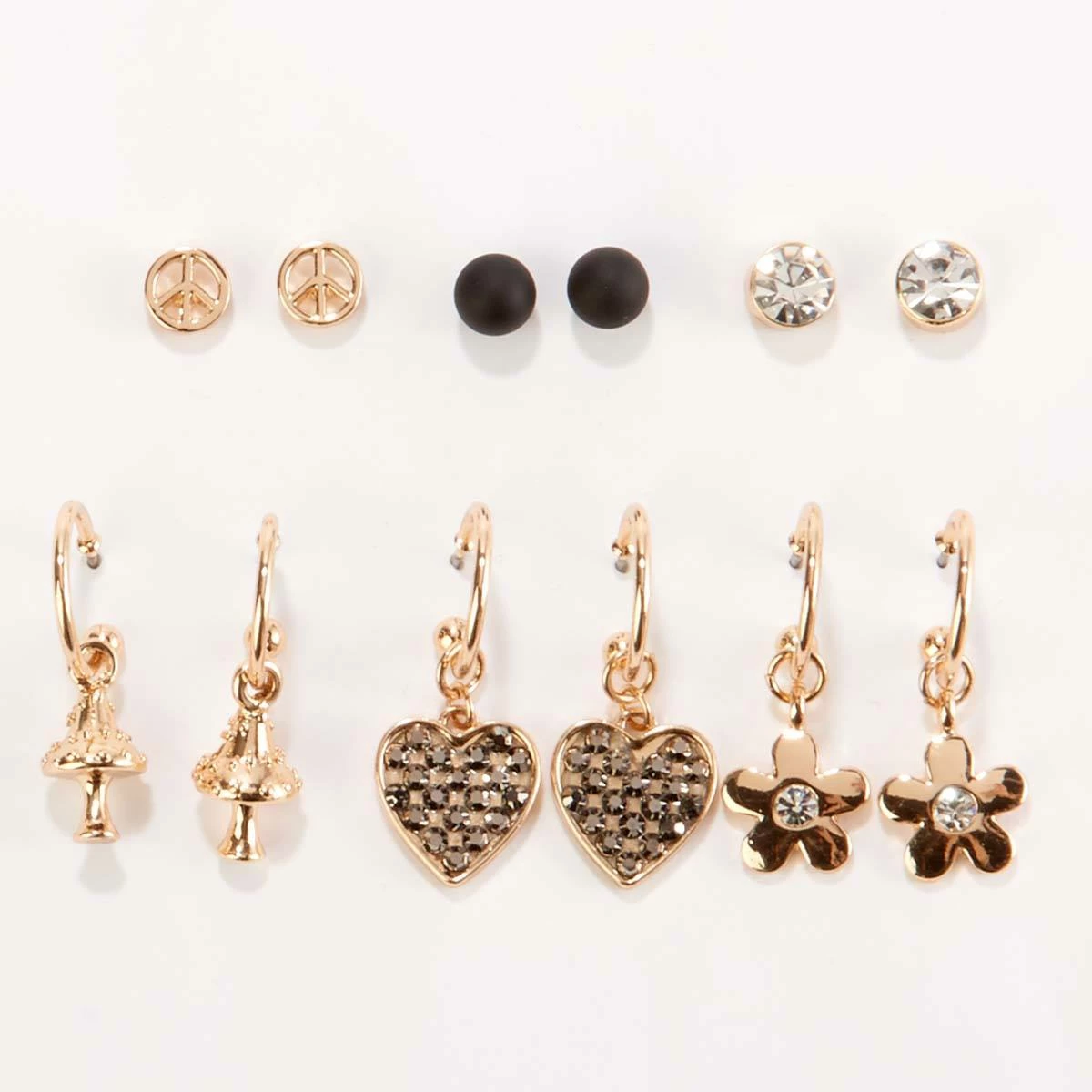 You will love the versatility of this Ashley by Ashley Cooperβ’ 6-piece multi charm earring set which includes flowers, hearts, mushrooms, and peace signs.