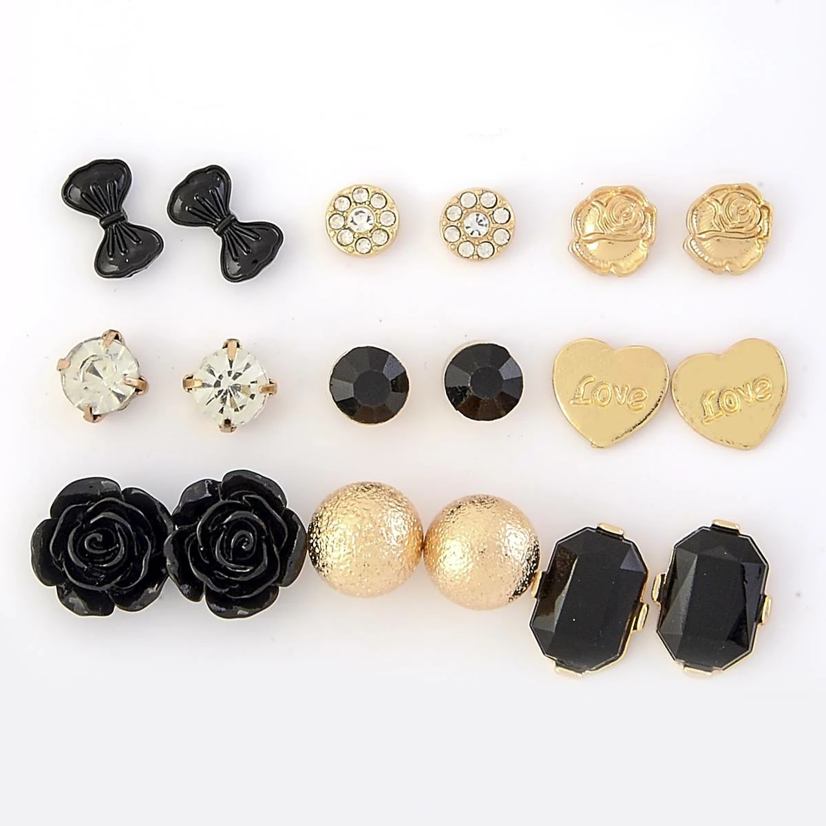 You will love the versatility of the 9 pairs of Ashley by Ashley Cooperβ’ gold plated post earrings with jet and crystal stones including hearts, bows, and flower motifs.