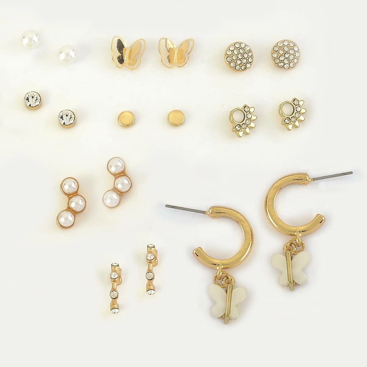 The Ashley by Ashley Cooperβ’ 9-pair pearl, butterfly, coin, bezel, fan, hoops, and stones earrings set is a must-add to your earring collection.