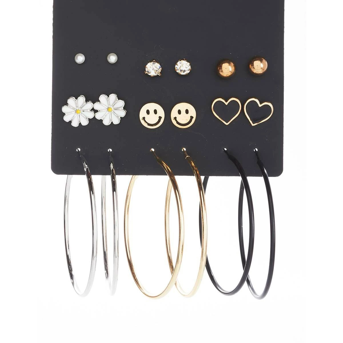 Mix and match these fashionable pairs of Ashley by Ashley Cooperβ’ gold, silver, and black plated post and hoop earrings set. Includes flowers, hearts, and smiley faces.