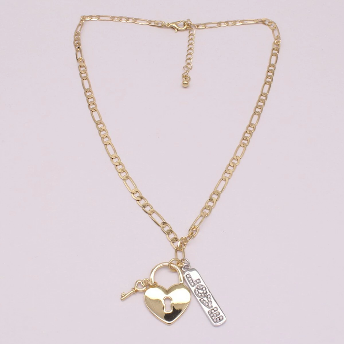 This Ashley by Ashley Cooperβ’ necklace features pave and silver LOVE bar with a classic lock and key in gold shimmers and is perfect for day or night wear.