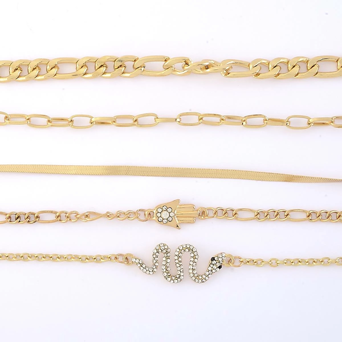 You will love the versatility of the Ashley by Ashley Cooperβ’ 5-piece gold plated metal chain bracelets, including pave snake and pave hamsa charms.
