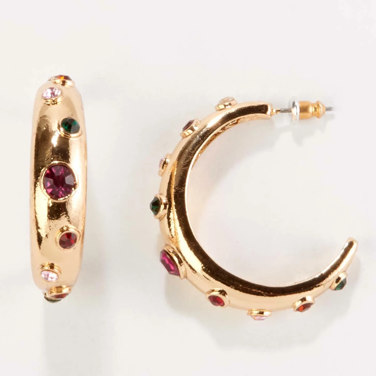 These Ashley Cooperβ’ multi-color stones hoop earrings will bring a rainbow of color to your outfit.